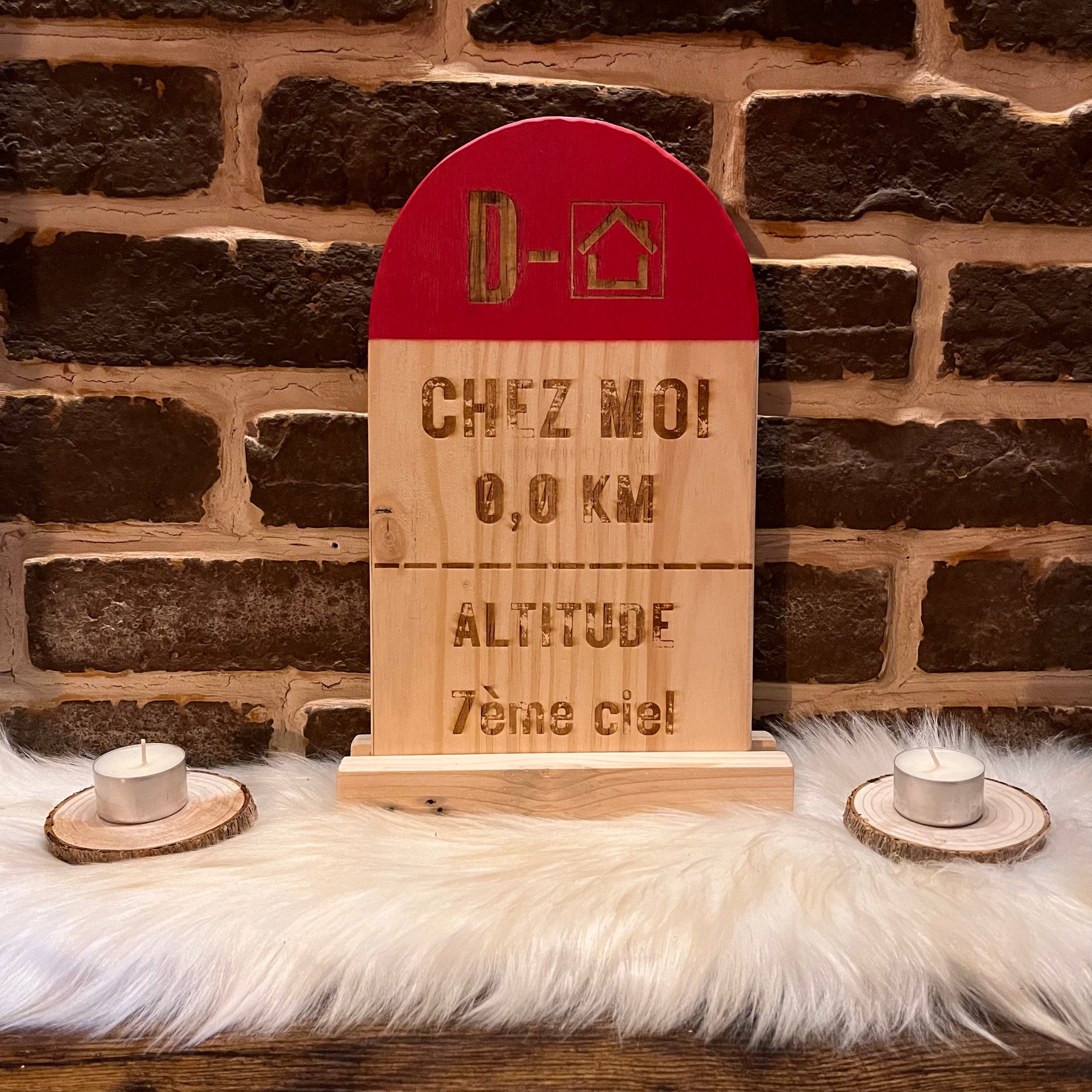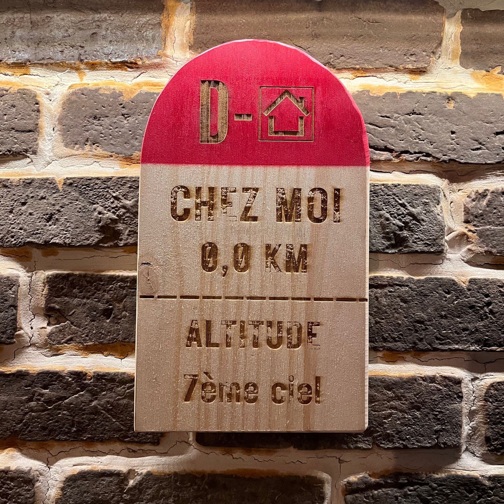 Borne kilométrique en bois gravée au laser et peinte.