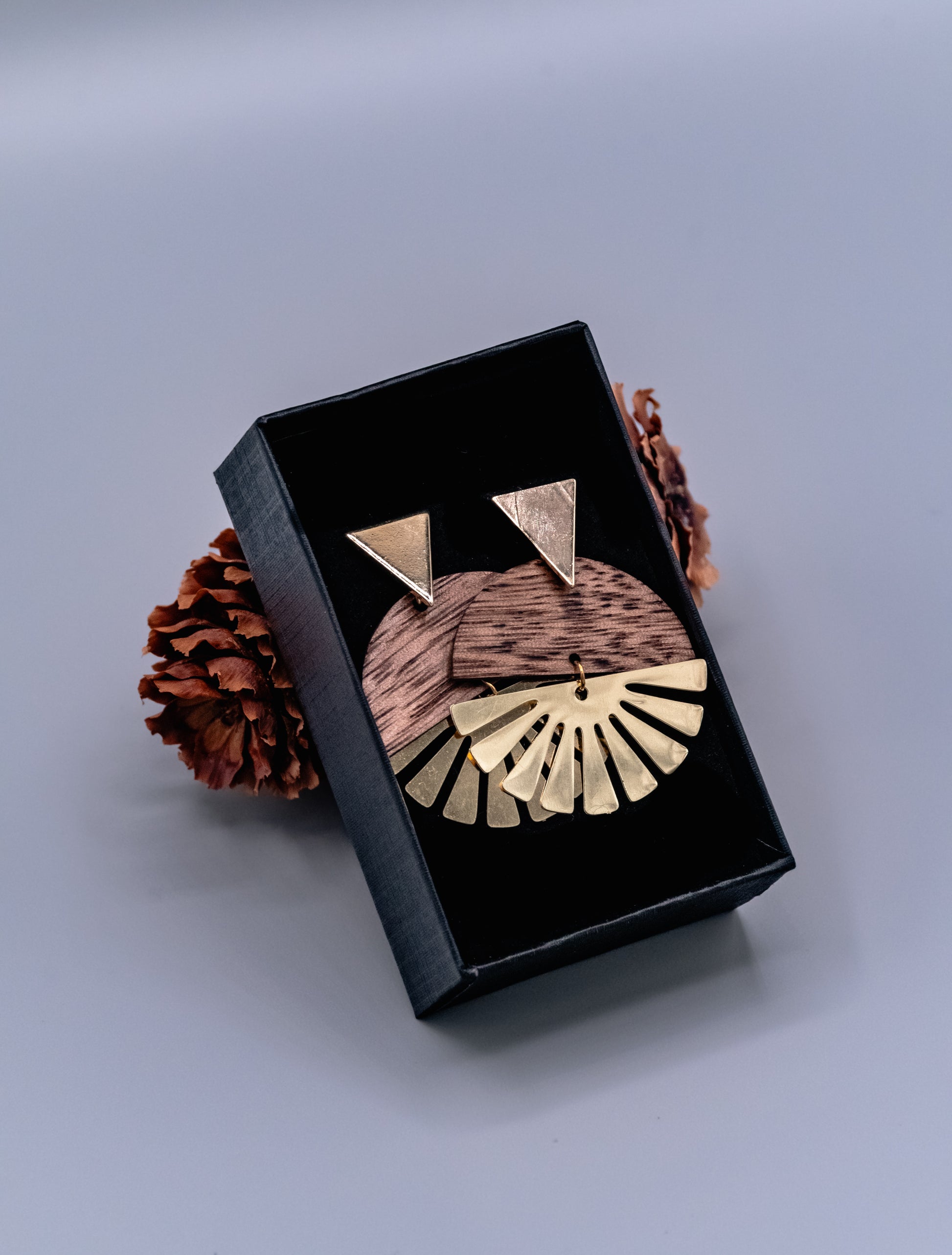 Boucles d’oreilles en Fraké et breloque en laiton dorée. Bois vernis