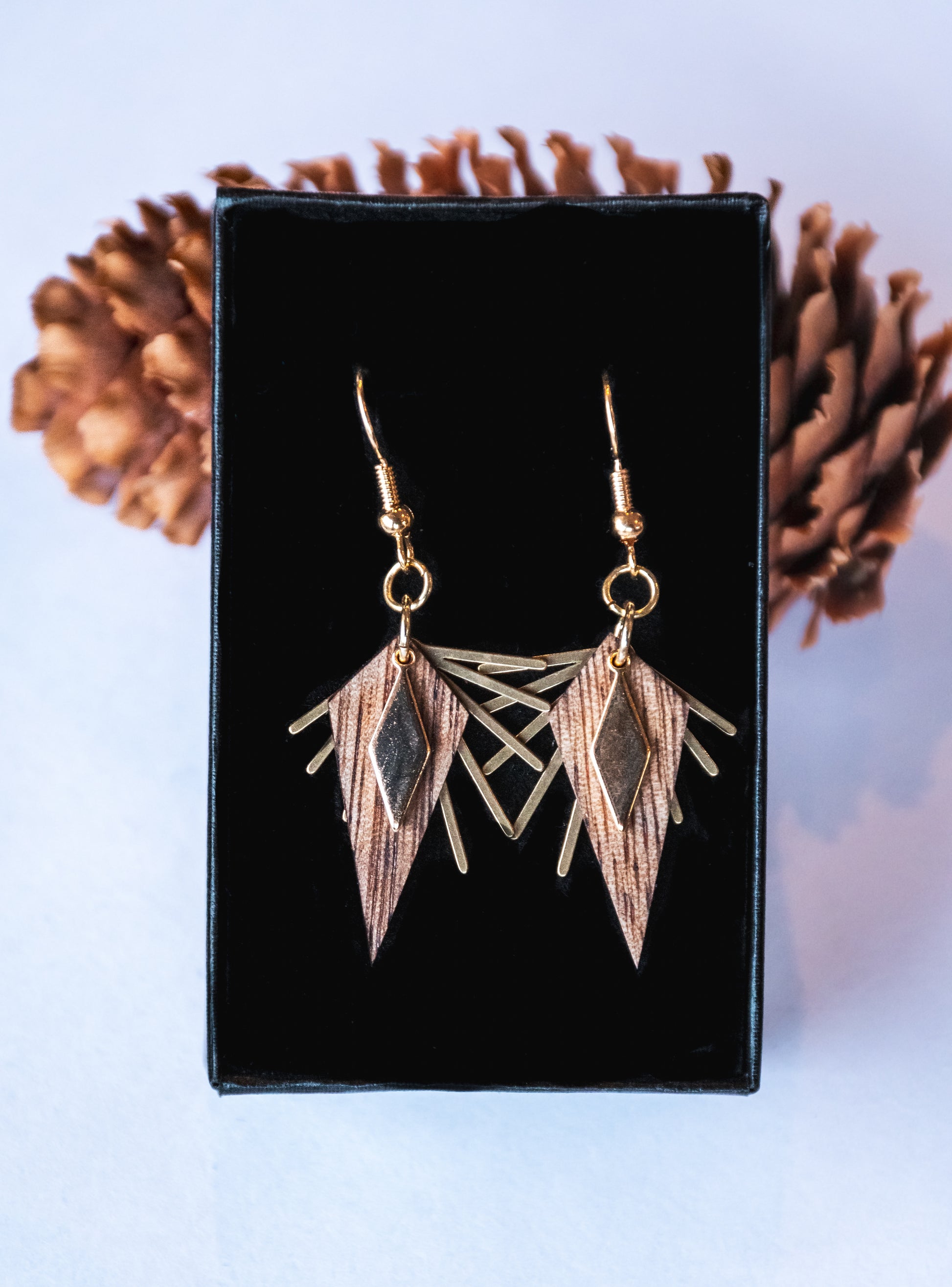 Boucles d’oreilles en Fraké et breloque en laiton dorée. Bois vernis