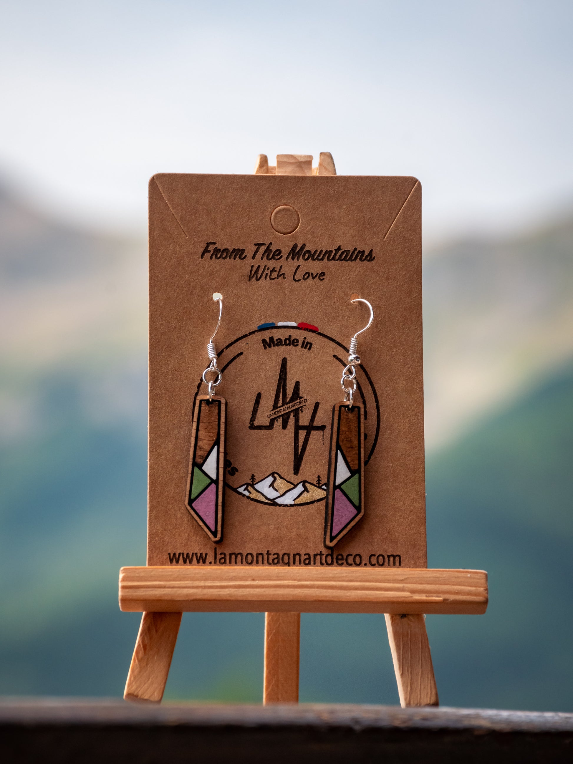 Boucles d’oreilles en bois de hêtre, peintes et assemblées à la main. Une couche de vernis est appliquée pour une meilleure protection.