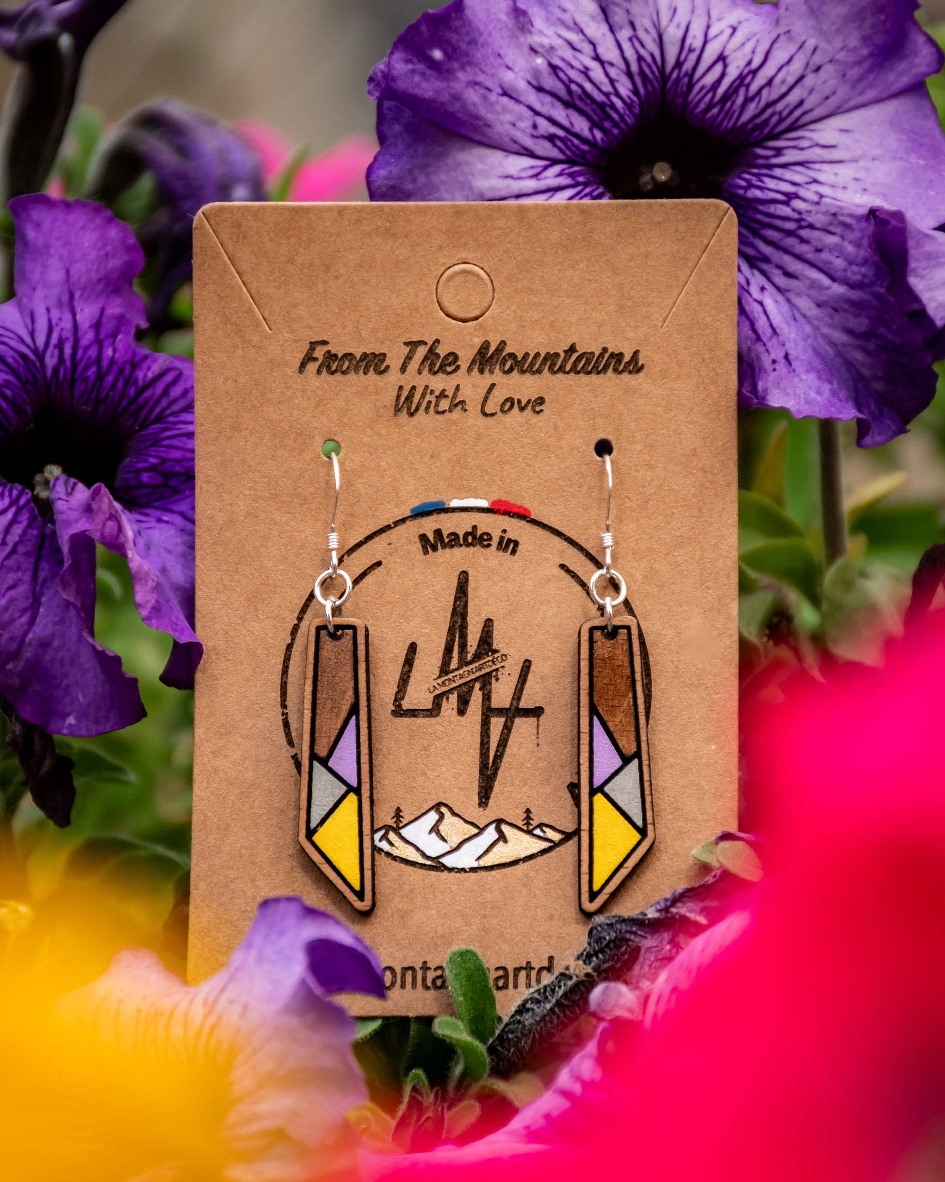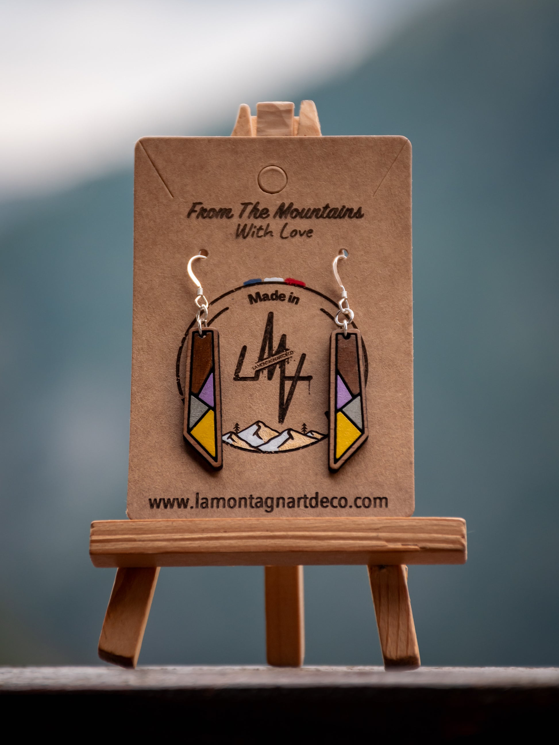 Boucles d’oreilles en bois de hêtre, peintes et assemblées à la main. Une couche de vernis est appliquée pour une meilleure protection.