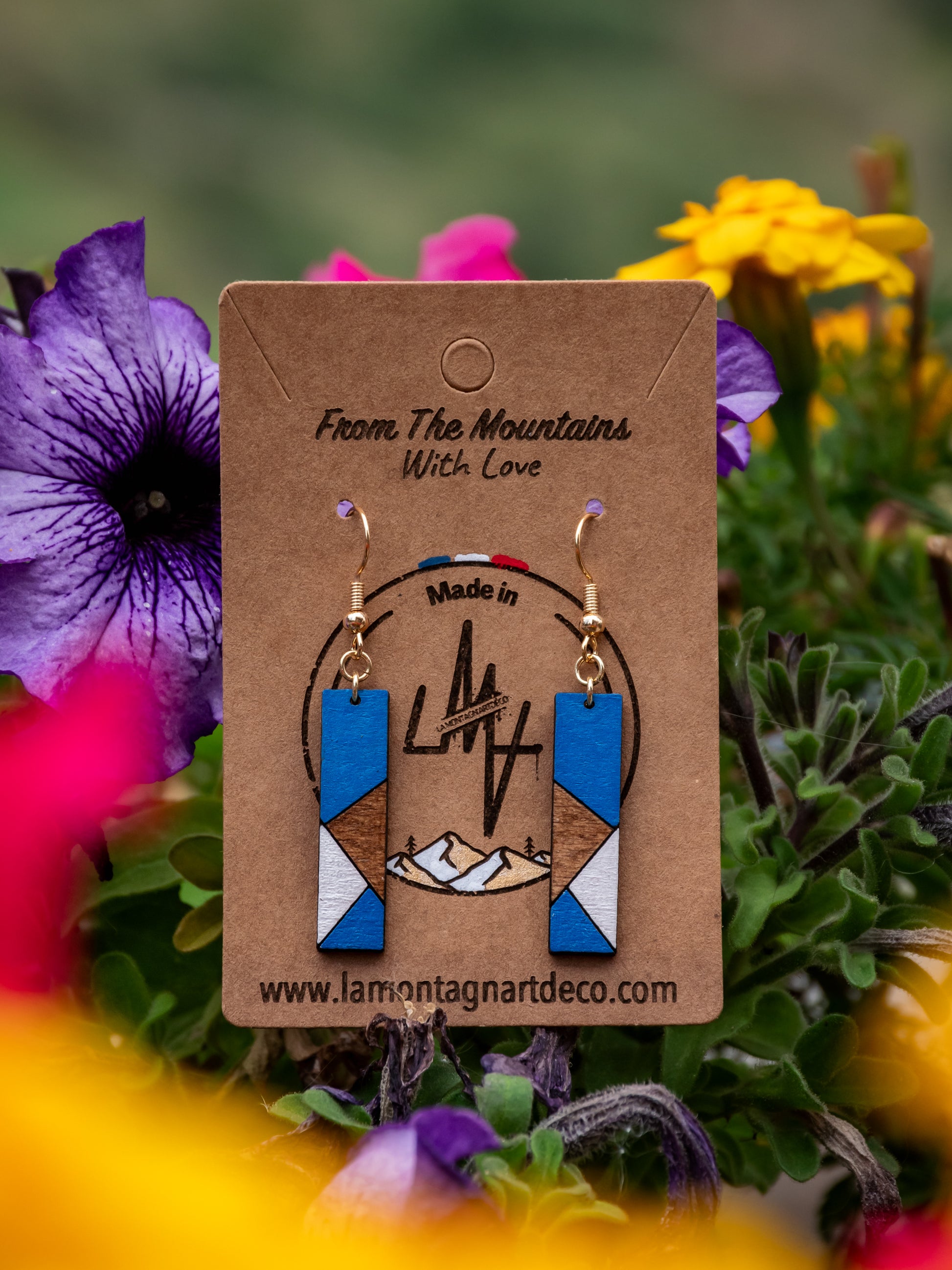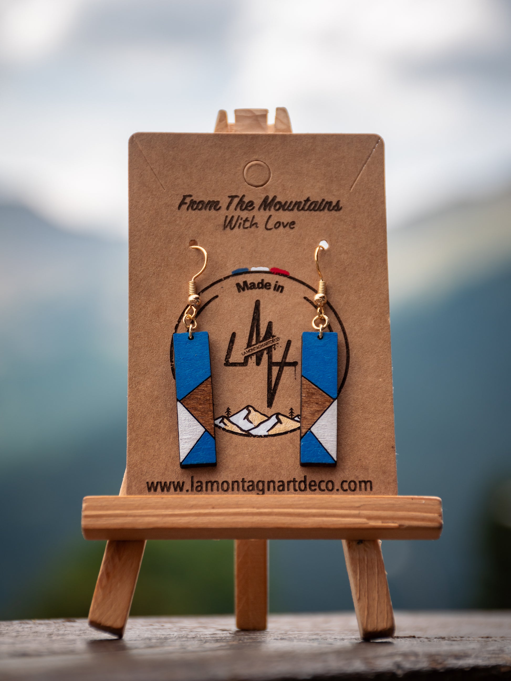 Boucles d’oreilles en bois de hêtre, peintes et assemblées à la main. Une couche de vernis est appliquée pour une meilleure protection.