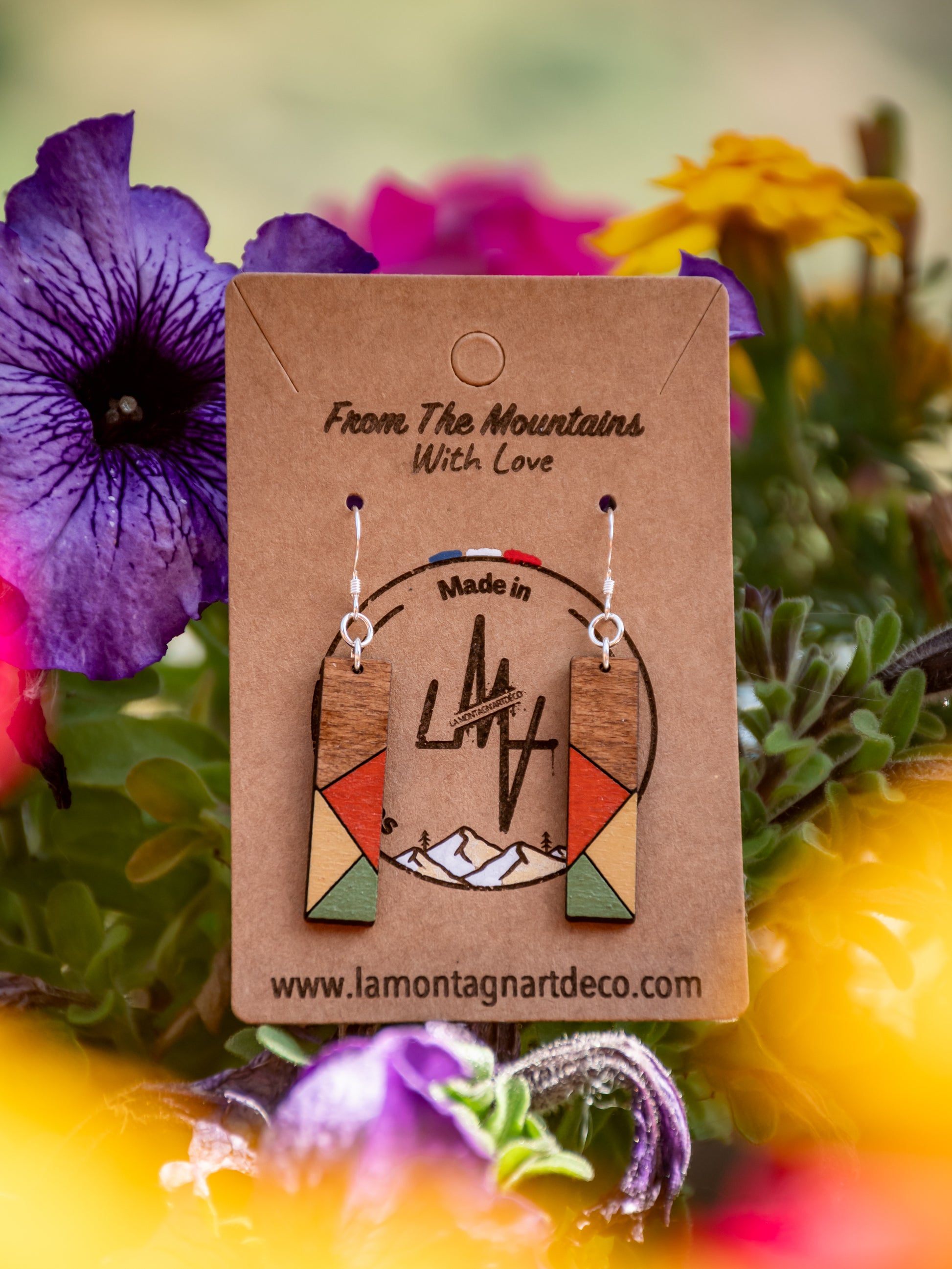 Boucles d’oreilles en bois de hêtre, peintes et assemblées à la main. Une couche de vernis est appliquée pour une meilleure protection.