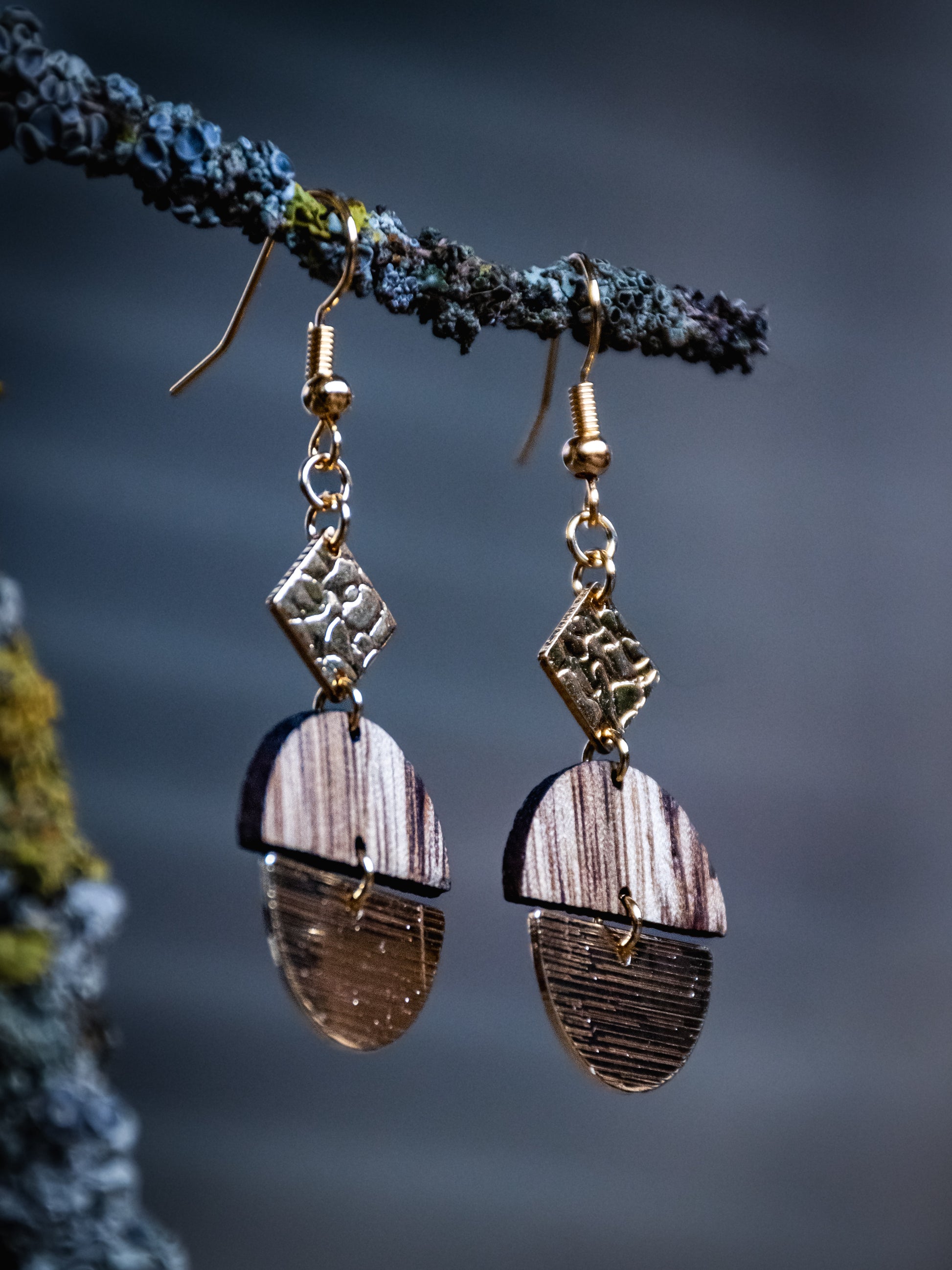 Boucles d’oreilles en Fraké et breloques en laiton dorées à l’or fin. Une huile minérale est appliquée pour une meilleure protection.