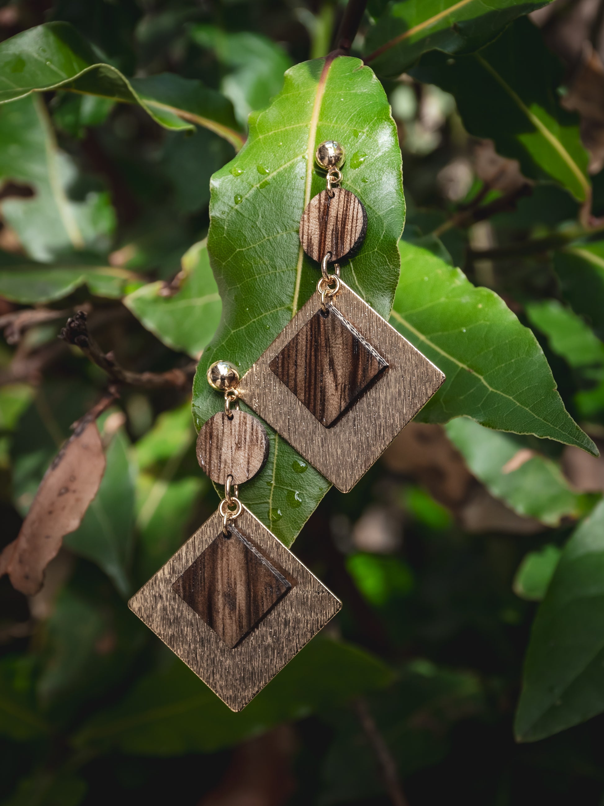 Boucles d’oreilles en Fraké et breloques en laiton dorées à l’or fin. Une huile minérale est appliquée pour une meilleure protection.