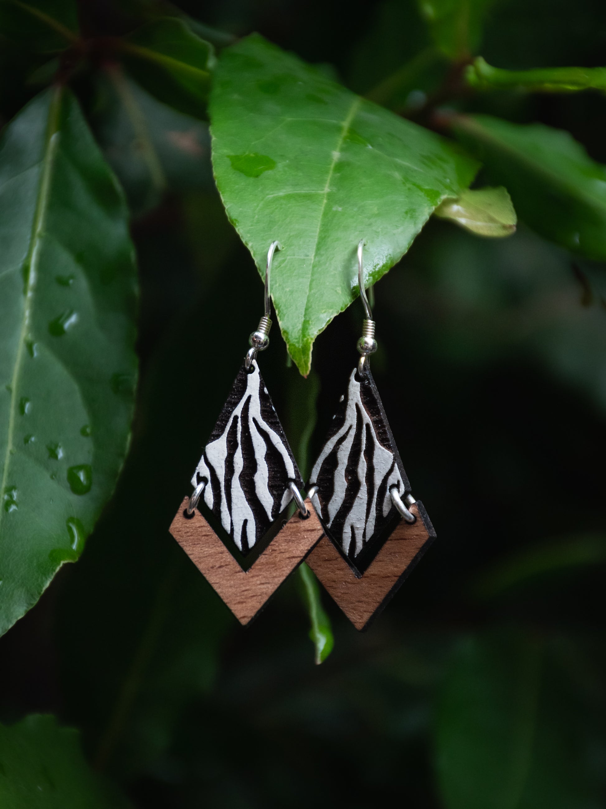 Boucles d’oreilles en bois de hêtre, peintes et assemblées à la main. Une couche de vernis est appliquée pour une meilleure protection.