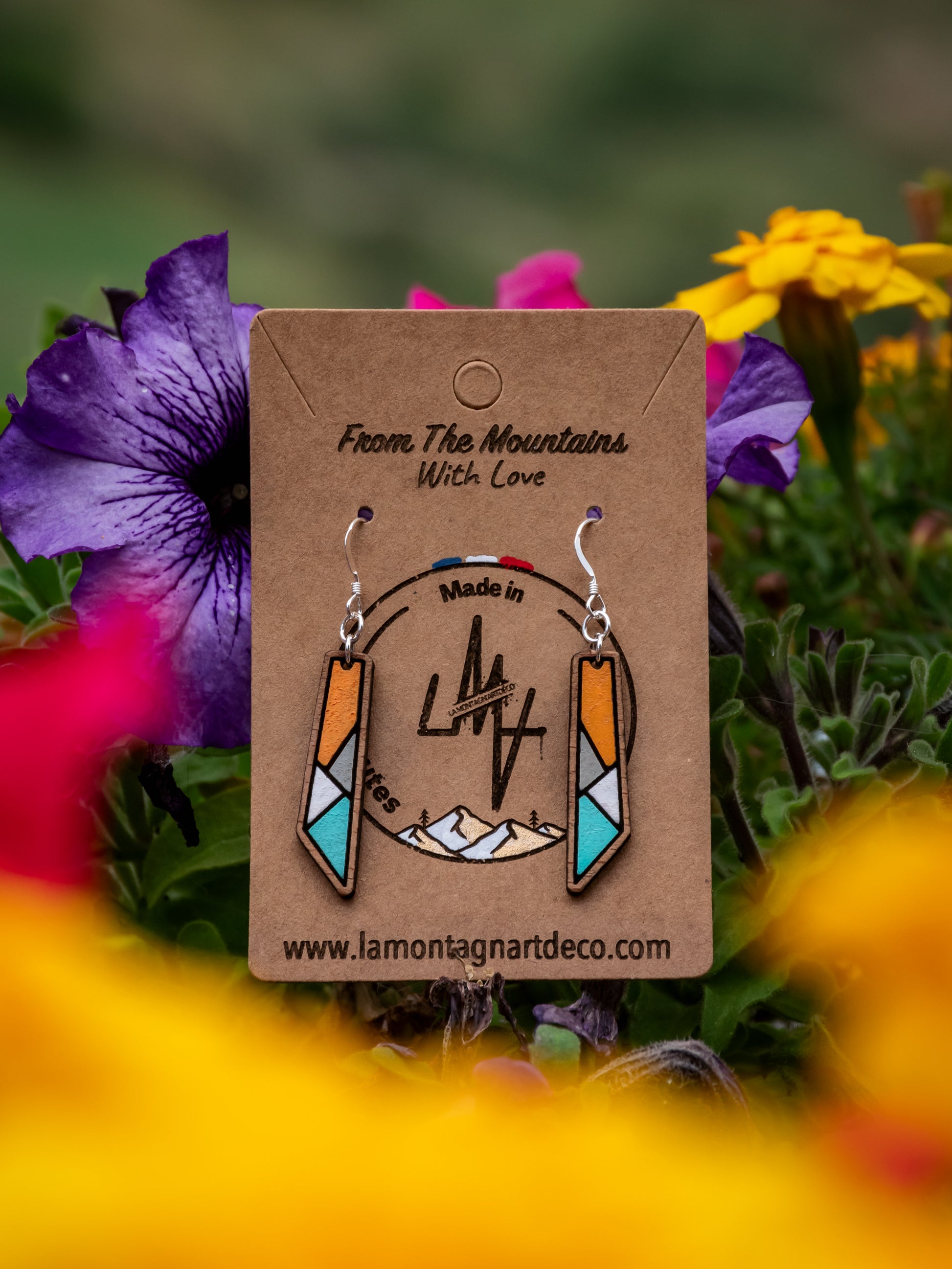 Boucles d’oreilles en bois de hêtre, peintes et assemblées à la main. Une couche de vernis est appliquée pour une meilleure protection.