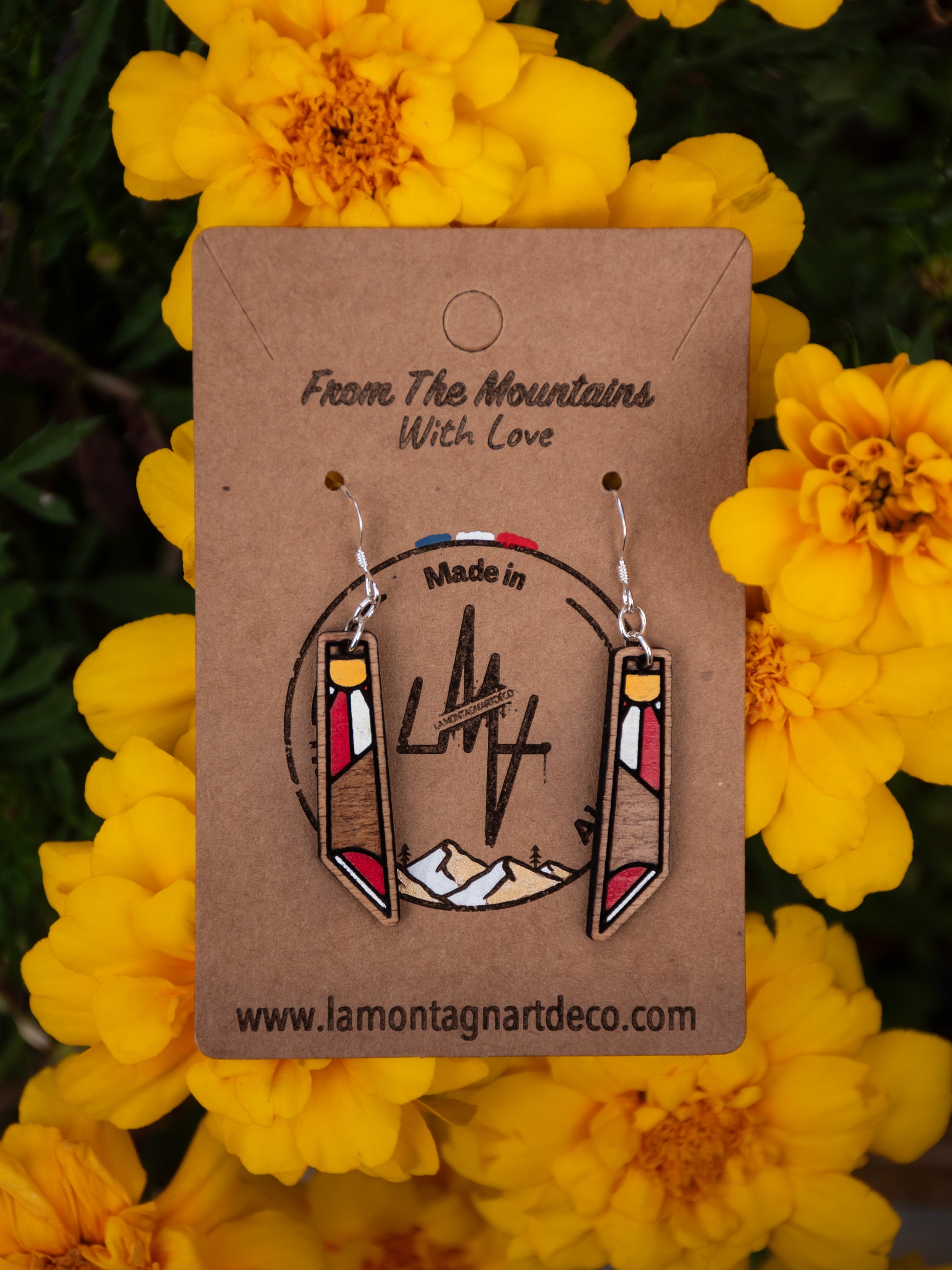 Boucles d’oreilles en bois de hêtre, peintes et assemblées à la main. Une couche de vernis est appliquée pour une meilleure protection.
