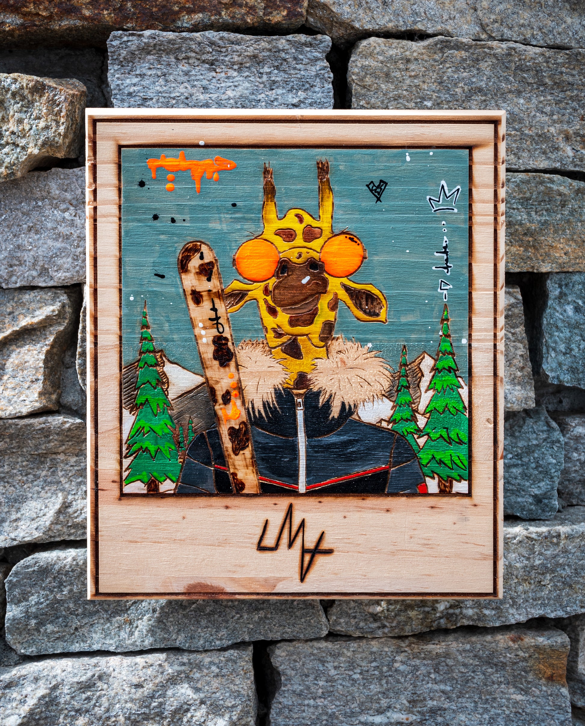 Tableau style polaroid peint à l’acrylique + gravure et pyrogravure.