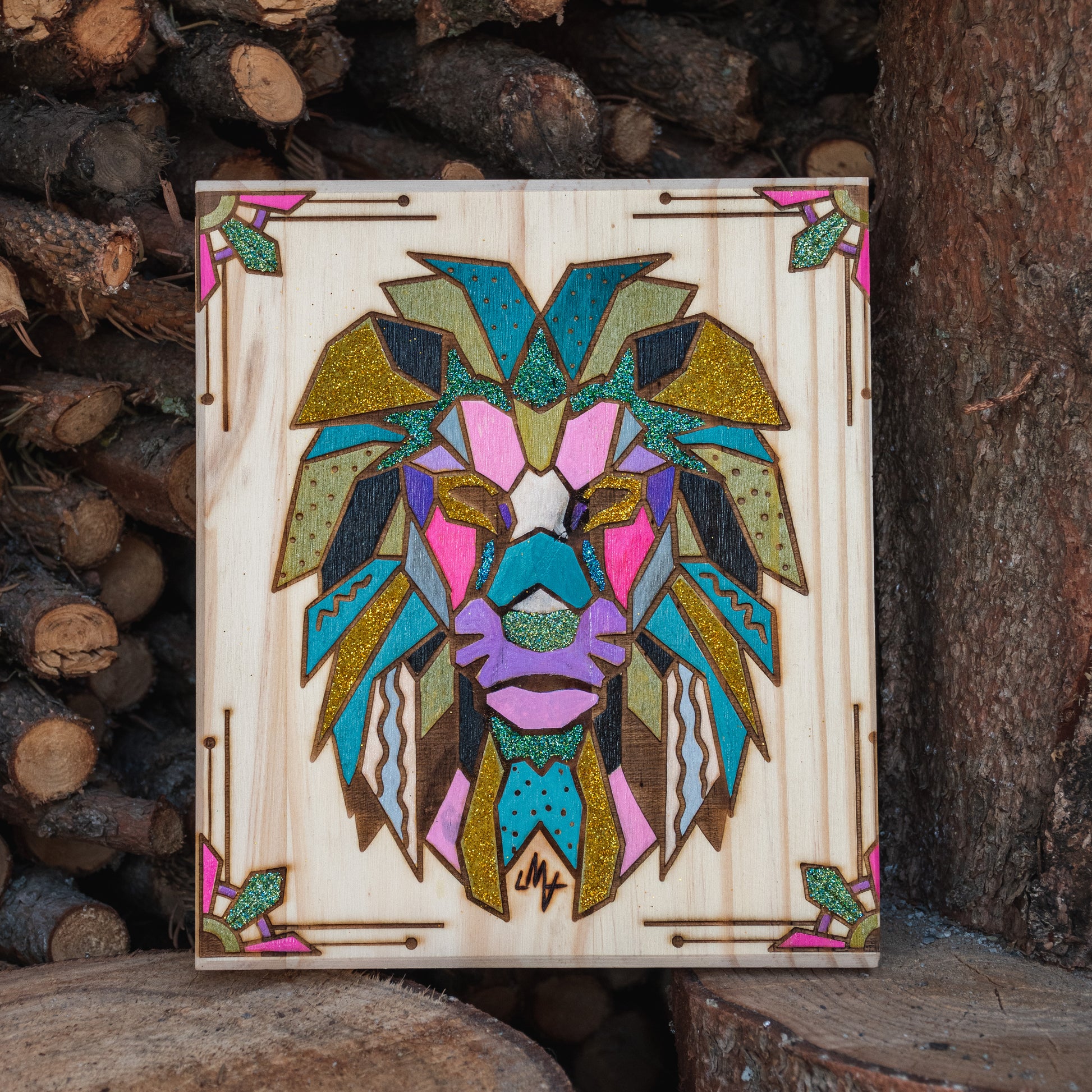 Tableau style polaroid peint à l’acrylique + paillettes, gravure et pyrogravure.