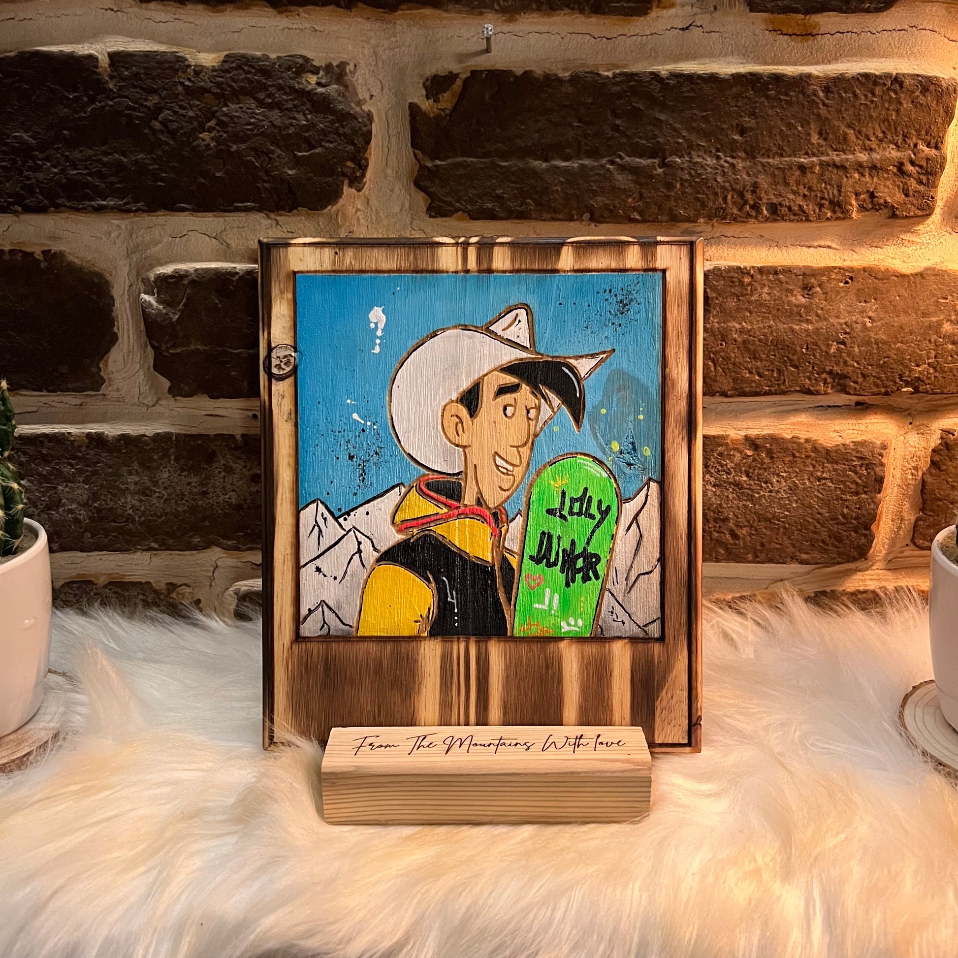 Tableau style polaroid peint à l’acrylique, gouache, gravure et pyrogravure.